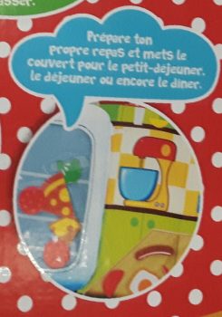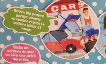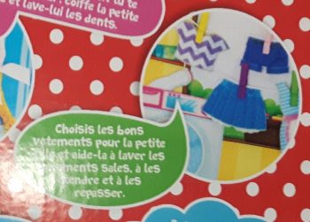 J’ai failli m’étouffer quand j’ai lu le texte correspondant à l’illustration de l’édition fille. Donc, on en est encore là en 2017 ? Le petit garçon ouvre son garage et travaille. La petite fille apprend à s’occuper des autres, du linge, de la cuisine.