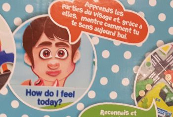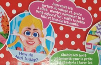 L’illustration pourrait être identique puisque l’objectif est le même : apprendre les parties du visage et exprimer son humeur. Pourquoi donc préciser dans l’édition fille de coiffer et laver les dents de la petite fille ? Parce que le rôle social attribué aux femmes est de prendre soin des enfants et s’occuper d’eux.